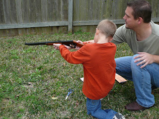 Brent went through all the rules of shooting a gun, handling the gun, gun safety, etc. It stays in our closet and he can only have it out when we are home and someone is with him while he shoots it. He has followed the rules wonderfully and has shown some great responsibility with it.